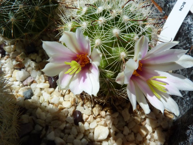 Mammillaria insularis San Borja ouvre aujourd’hui ses deux premières fleurs malgré les températures qui ont baissé ces derniers jours. Ce sont de bien grandes fleurs au joli pistil vert.