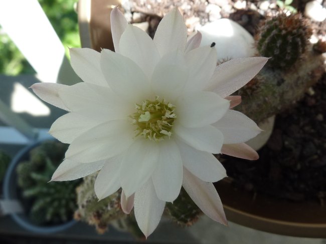 Ce Chamaelobivia sp blanc provient comme beaucoup de mes plantes de mon amie Jocelyne. Il fleurit alors pour la première fois en juin 2019. Il refleurira ensuite en 2020. Les pétales blancs sont légèrement teintés de rose et pointus.